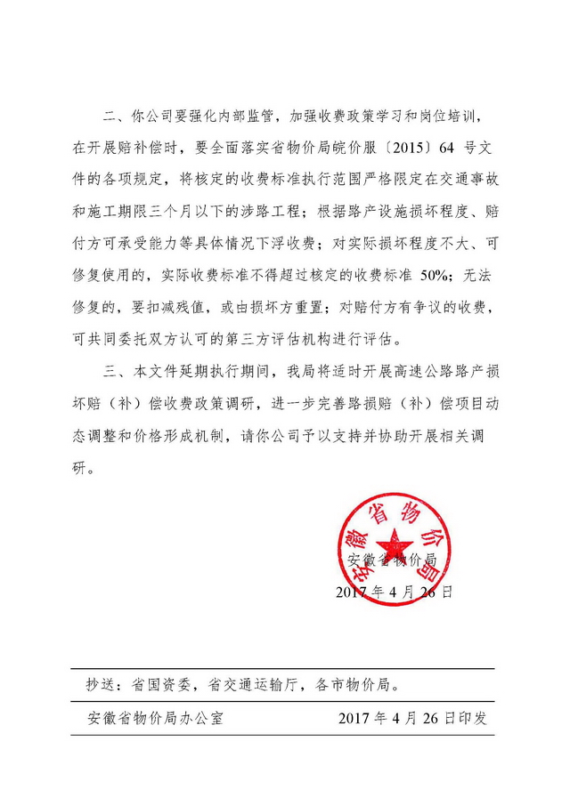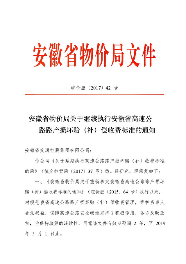 安徽省物價(jià)局關(guān)于繼續(xù)執(zhí)行安徽省高速公路路產(chǎn)損壞賠(補(bǔ))償收費(fèi)標(biāo)準(zhǔn)的通知